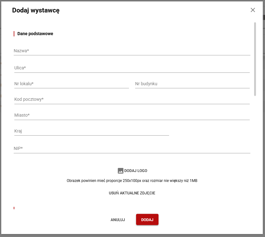 Po kliknięciu „Dodaj wystawcę” należy uzupełnić formularz: